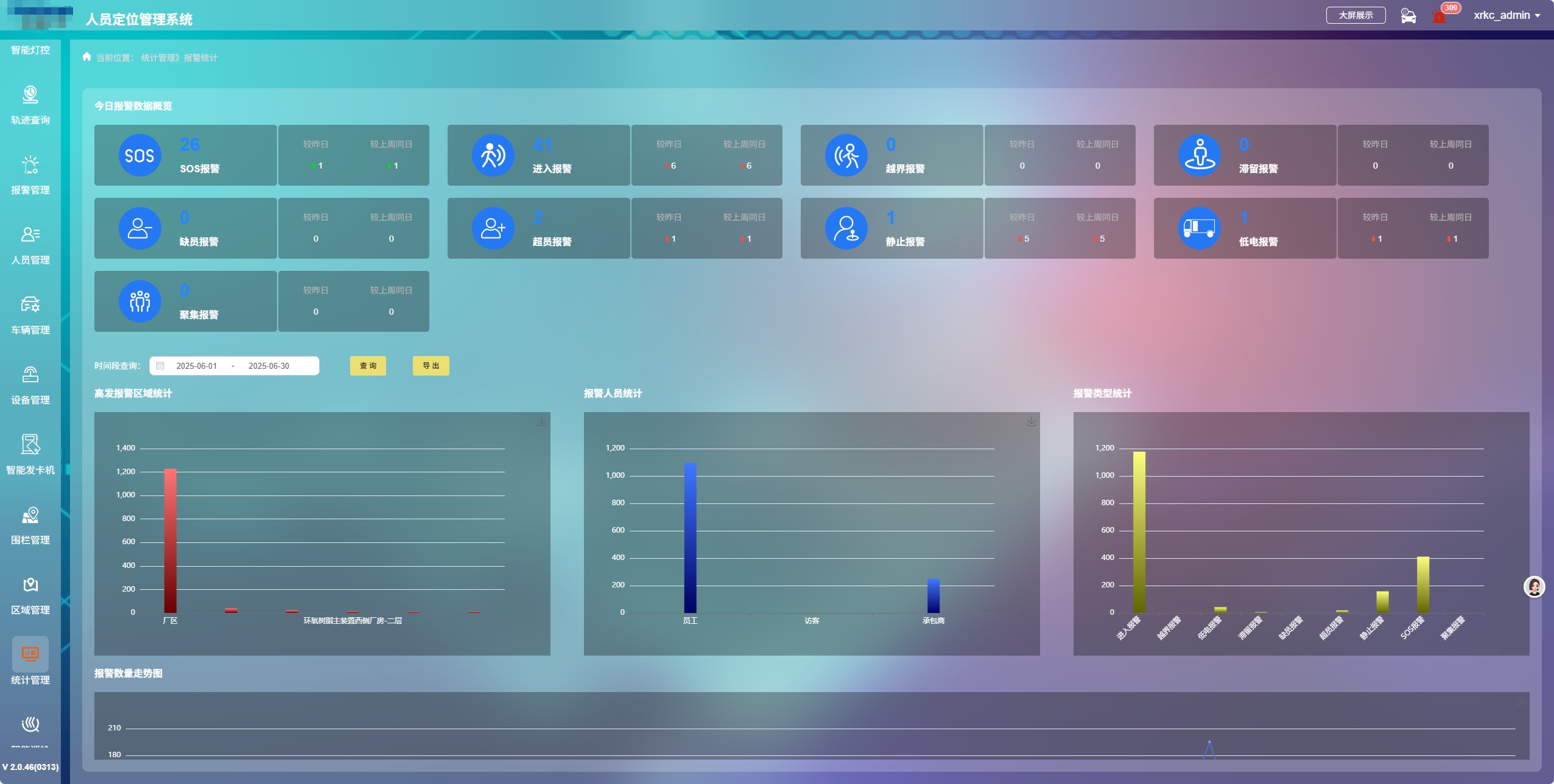 支持各類數據的實時統計分析,提供全面的數據報表和可視化工具,以圖表形式展示各區域人員分布及報警信息等關鍵數據。