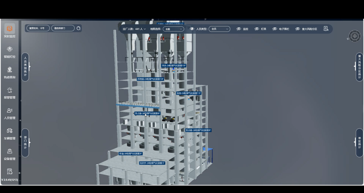 系統(tǒng)支持在2D/3D電子地圖上實(shí)時(shí)顯示人員位置分布,可分樓層、分車間顯示;可對(duì)每個(gè)人的實(shí)時(shí)位置進(jìn)行跟蹤,實(shí)現(xiàn)了對(duì)人員位置的實(shí)時(shí)追蹤和展示。