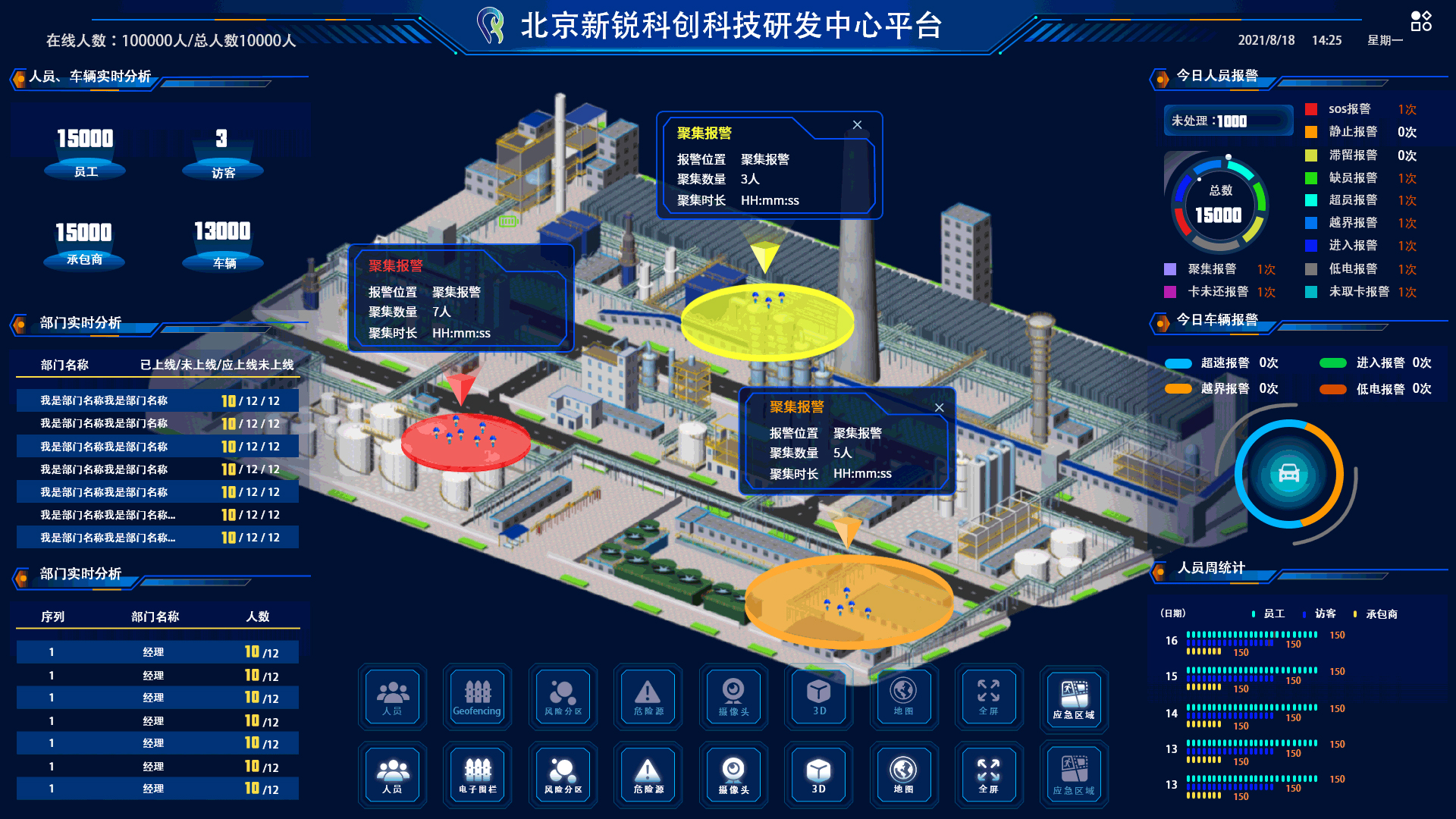 支持動態設定人員聚集預警閾值,支持人員聚集實時狀態的分析記錄和歷史查詢、回放及報表生成,支持對人員聚集風險監測預警功能的參數設置、權限管理、日志審計等,實現及時發現和管控人員聚集風險。