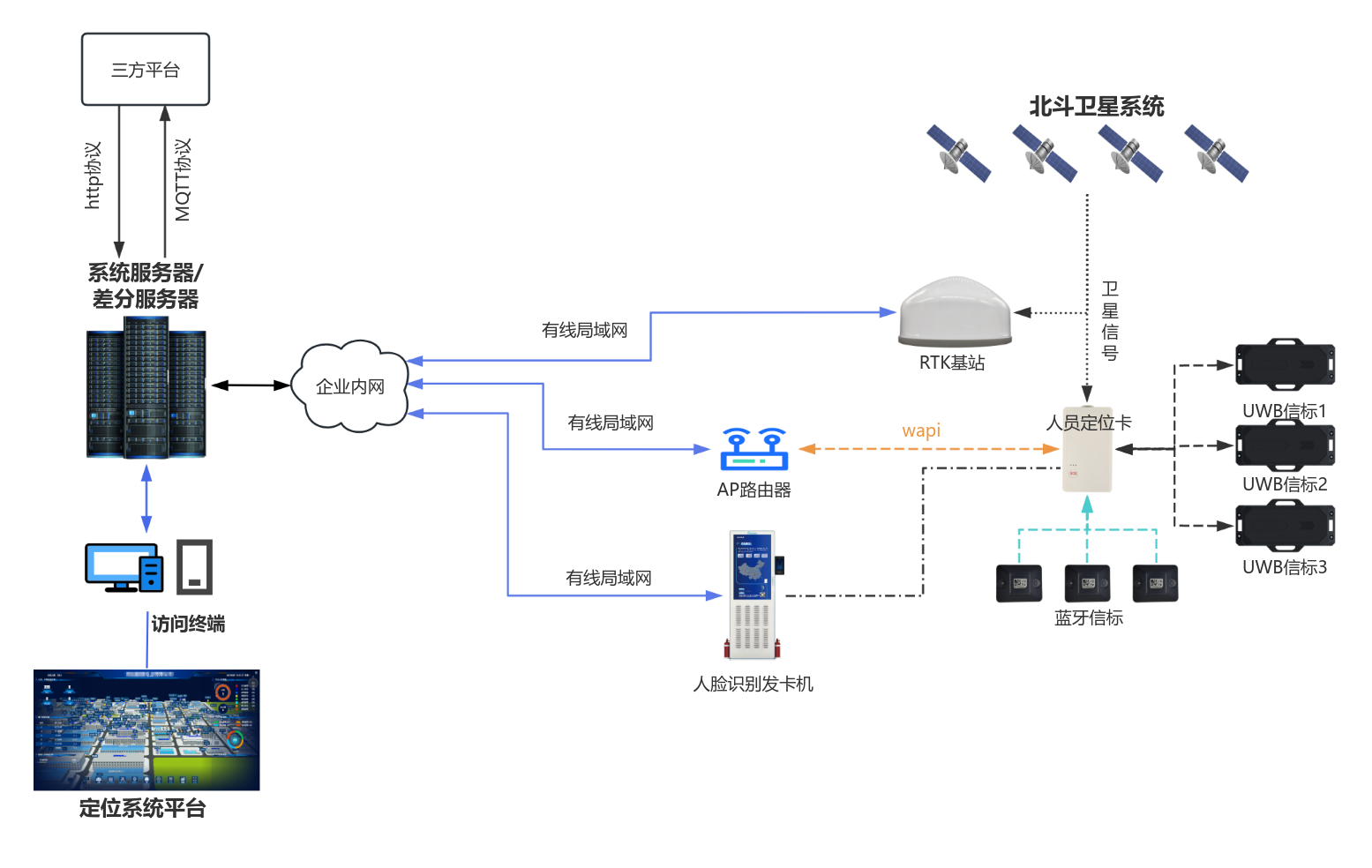 本方案基于高精度定位+安全傳輸的核心理念,整合北斗RTK、UWB、藍牙、WAPI四大技術的核心優勢,構建全場景、高安全、高精度的人員與車輛定位體系。其中,UWB技術承擔室內密閉、多遮擋環境下的亞米級定位任務;北斗RTK技術滿足室外開闊區域亞米級的高精度定位需求;藍牙技術作為輔助定位手段,實現室內短距離精確定位補充;WAPI技術則構建自主可控的安全局域網,為全系統定位數據、指令信息的傳輸提供加密保障,杜絕數據泄露與非法接入風險。